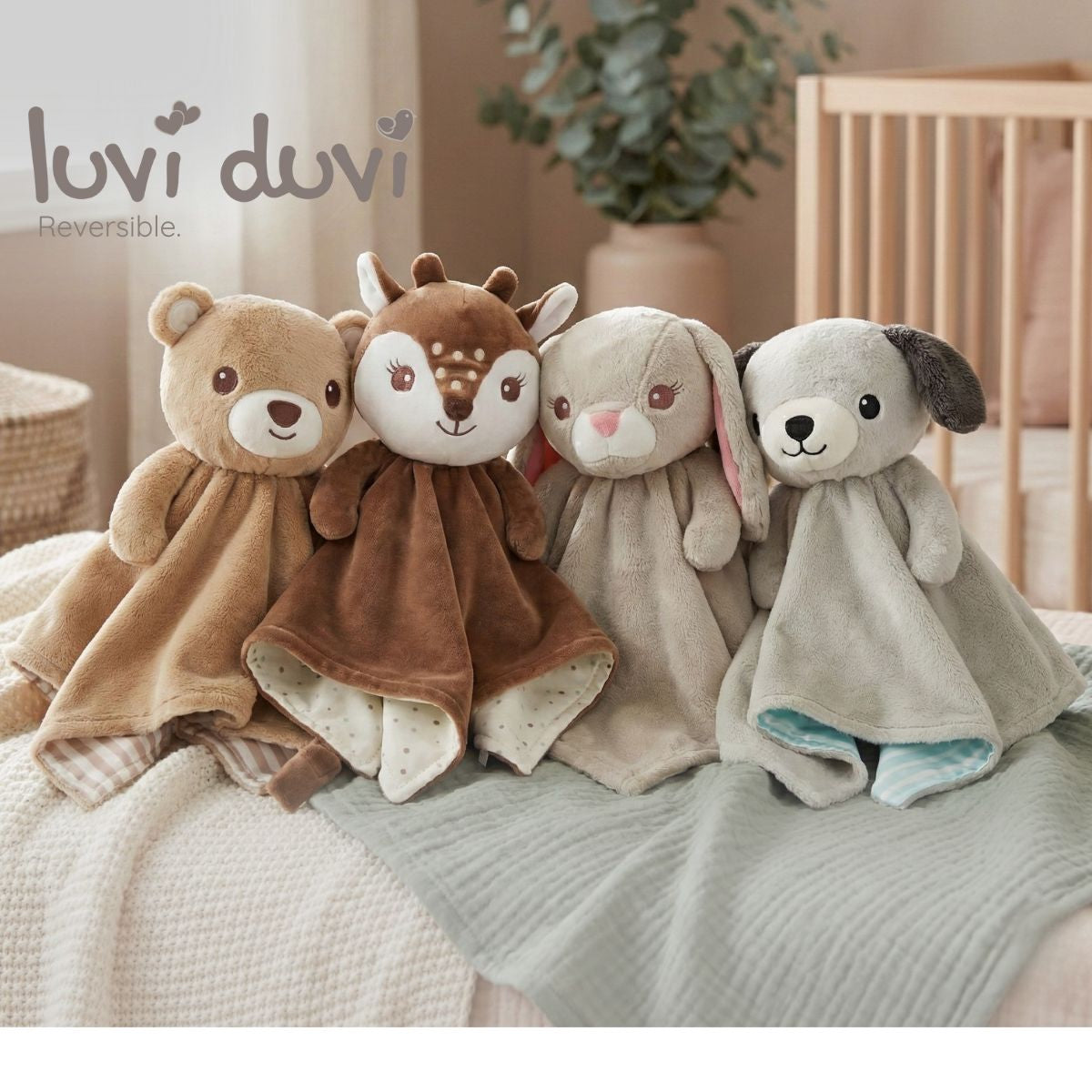 Four LuviDuvi™ reversible loveys—Teddy, Fawn, Bunny, and Puppy—lined up together, showing their soft fabrics and gentle character designs.